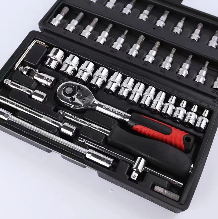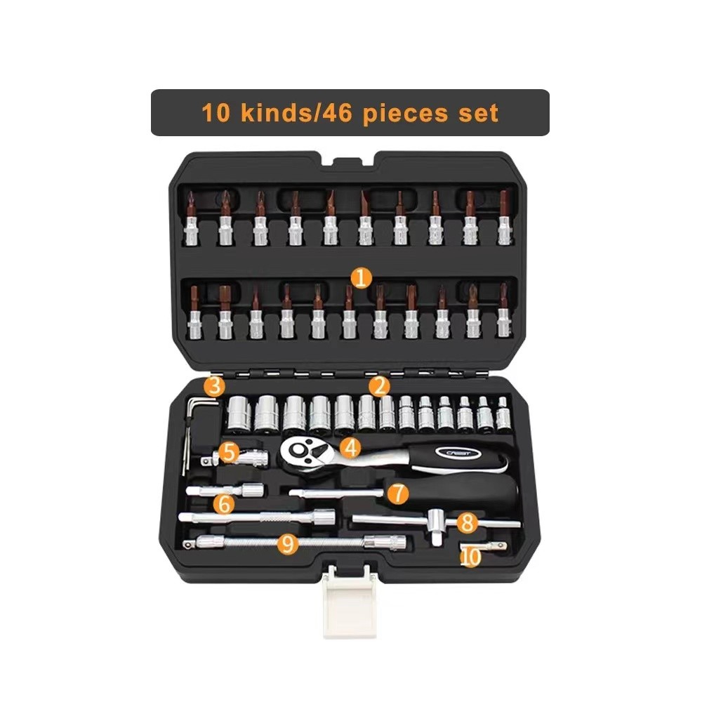 1. Total Pieces: 46 pcs 2. Drive Size: 1/4” 3. Socket Type: Metric 6-Point 4. Bit Sockets: Slotted / Phillips / Torx / Hex 5. Ratchet Handle: 1/4” Drive, Reversible 6. Extensions: 2 pcs 7. Universal Joint: Yes 8. Material: Chrome Vanadium Steel (CR-V) 9. Finish: Full Chrome Plated 10. Case: Blow Molded Case 11. OEM/ODM: Available